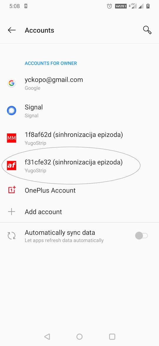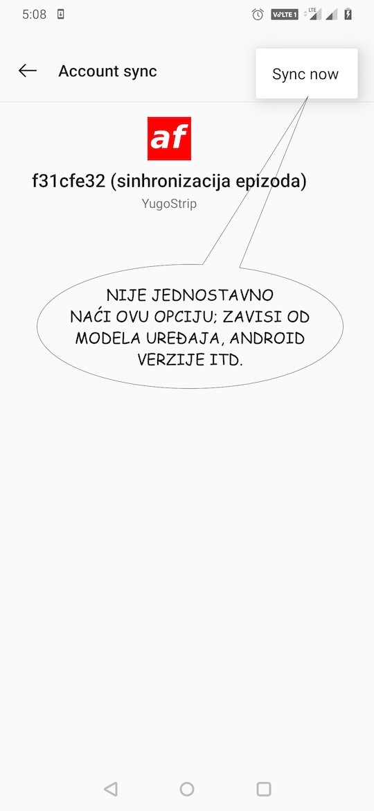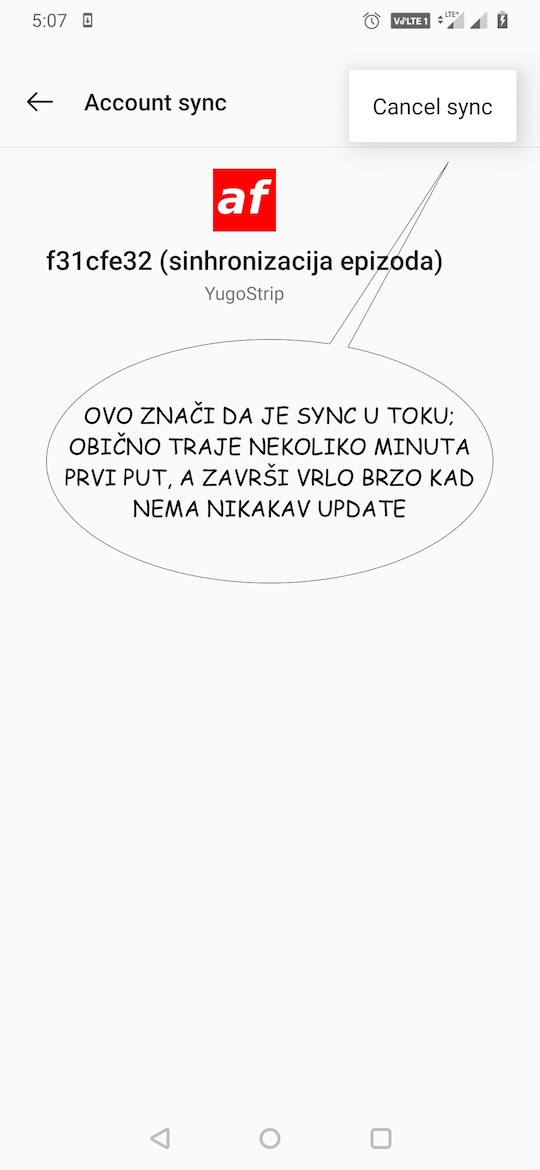 Aplikacija kreira na Vašem uređaju "account" koji nekima može izgledati sumnjivo ako ga primete. Ovaj account se koristi za periodičnu sinhronizaciju epizoda kao što je opisano u Android dokumentaciji. Primer imena je "f31cfe32 (sinhronizacija epizoda)" i na Vašem uređaju prvih 8 slova će biti drugačije. Account se ne koristi ni za šta drugo. Osim periodične sinhronizacije koja radi automatski jednom dnevno, epizode možete sinhronizovati ručno ako to Vaš uređaj podržava: